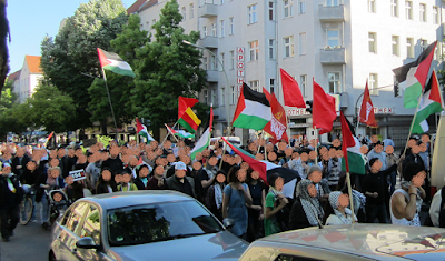 In der Sonnenallee wurde die Demo von Autos, Anwohnern und Passanten immer wieder gegrüßt und unterstützt. Es schallten "Viva Palästina!", "Hoch die internationale Solidarität!", "Intifada bis zum Sieg!" und viele arabische Sprechchöre und Gesänge durch die Straßen. Die mit Greiftrupps massiv präsente Polizei versuchte unterdessen während und auch nach der Demo verschiedene Jugendliche zu belästigen und zu kriminalisieren, indem sie die Parole "Tod, Tod, Tod dem Zionismus!" für per Auflage verboten erklärte und so erfolglos versuchte den Protest zu zensieren und in seiner Aussage zu beschneiden.